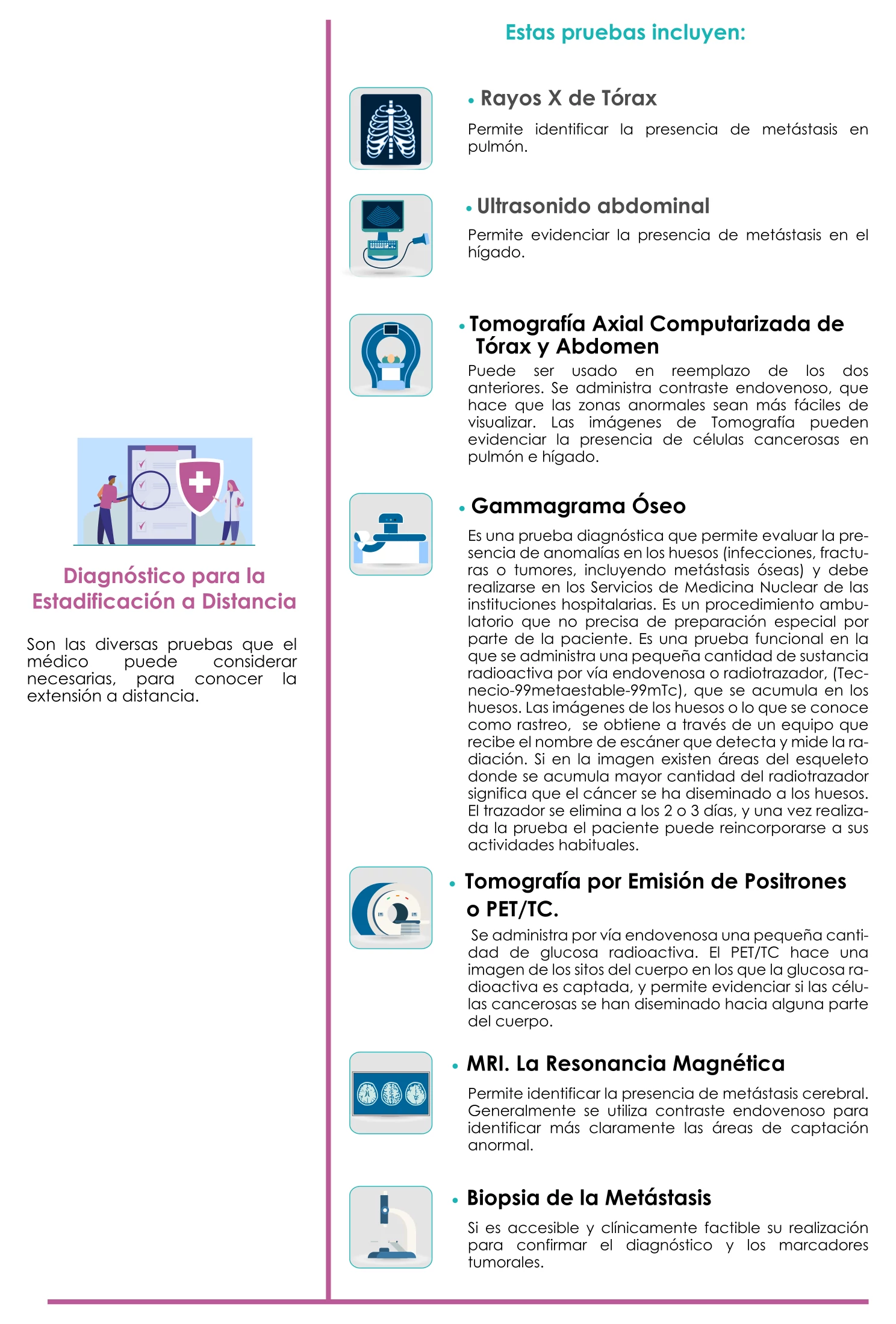 Son las diversas pruebas que el médico puede considerar necesarias, para conocer la extensión a distancia. Estas pruebas incluyen: