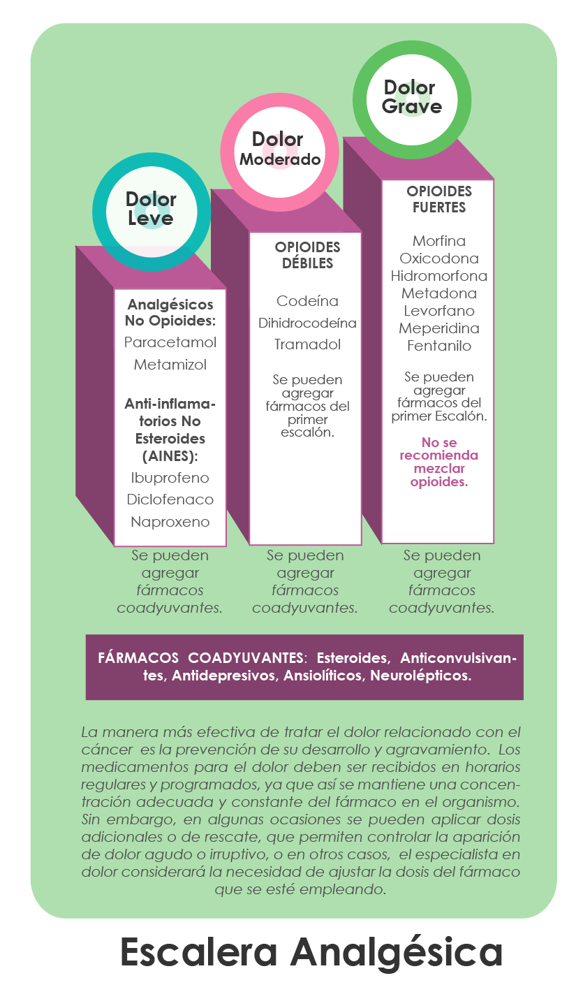Diferentes medicamentos se encuentran disponibles para aliviar el dolor, y a estos se les conoce como analgésicos, que pueden ser administrados por vía oral, endovenosa o bien como parches transdérmicos. La Organización Mundial de la Salud ha diseñado pautas para el tratamiento analgésico del dolor por cáncer. Estas pautas, son conocidas como la escalera analgésica de la Organización Mundial de la Salud. Este enfoque secuencial discrimina la selección de analgésicos, con eficacia demostrada y seguridad probada, en función de la gravedad del dolor.